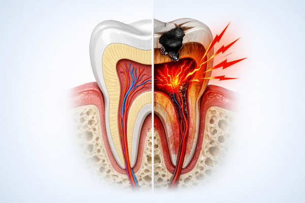 Классический сценарий, хорошо знакомый стоматологам. Кариес не возникает мгновенно — это процесс. Сначала на эмали образуется едва заметное пятно, затем формируется полость. Если на этом этапе проигнорировать визит к врачу, процесс неумолимо движется вглубь. Бактерии и токсичные продукты их жизнедеятельности растворяют дентин, неуклонно приближаясь к пульпе. Как только кариозная полость сообщается с пульповой камерой, инфекция врывается внутрь — это и есть старт пульпита. Чаще всего пульпит развивается из-за запущенного глубокого кариеса. Отсюда вывод: так важно лечить зубы на ранних этапах, когда реально обойтись щадящей пломбой и сохранить нерв в живом, функционирующем состоянии.